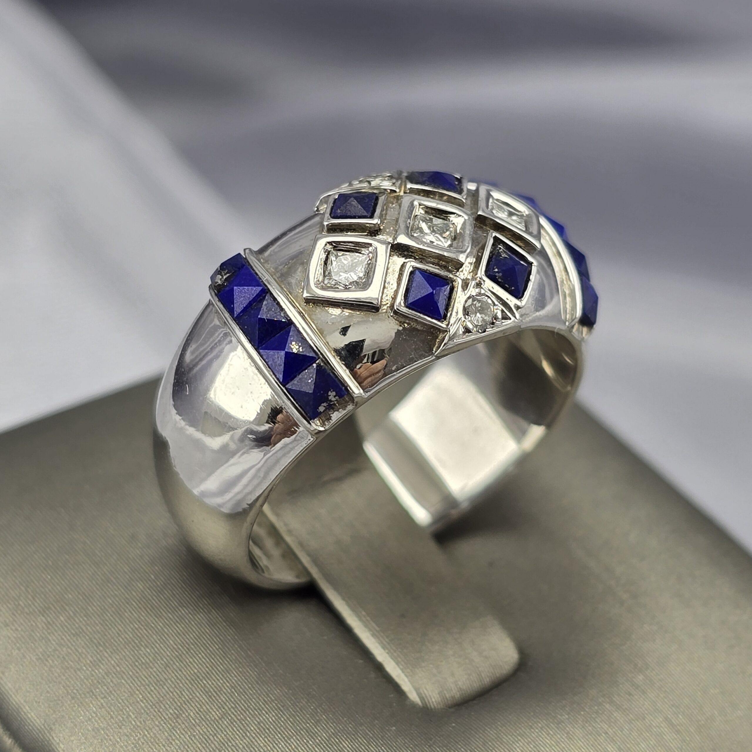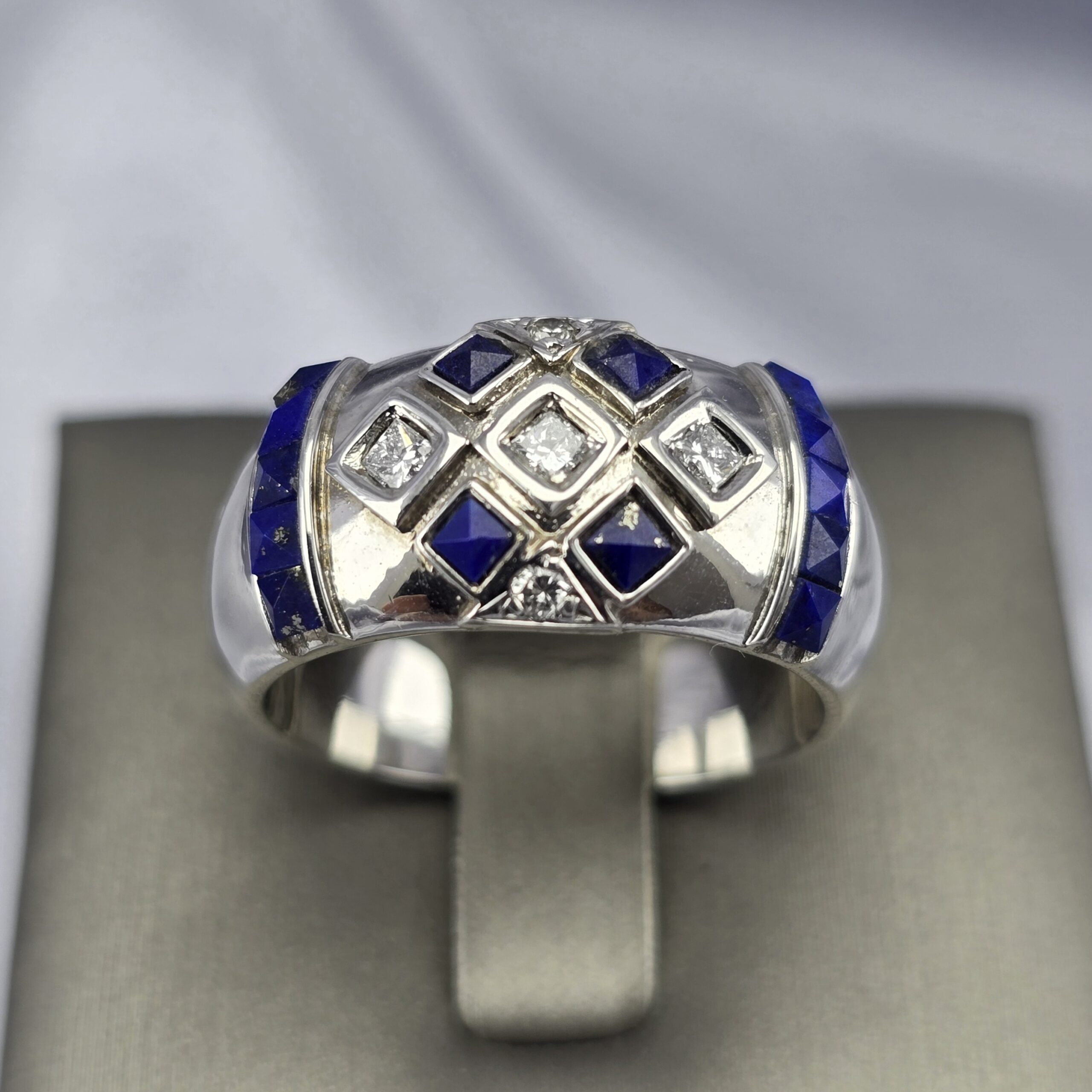 Este anillo de oro blanco de 18 quilates combina la luminosidad de los brillantes con la intensidad azul del lapislázuli en forma de cuadritos facetados, creando un contraste sofisticado y moderno.