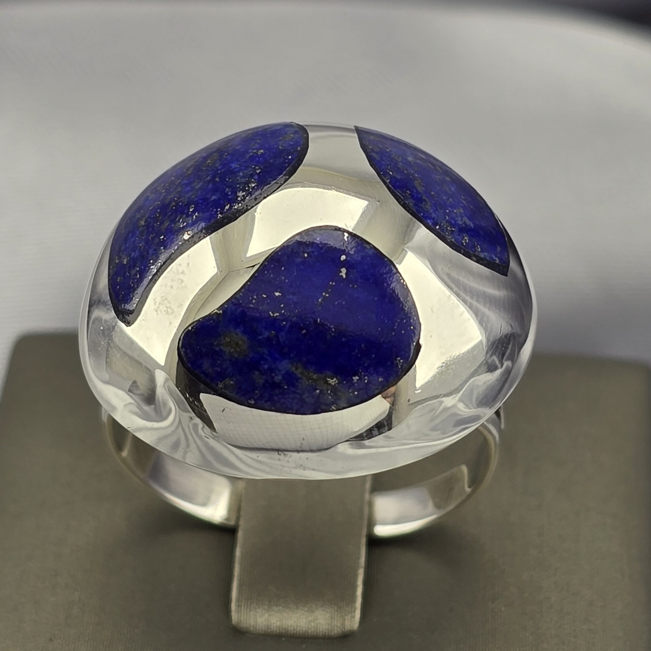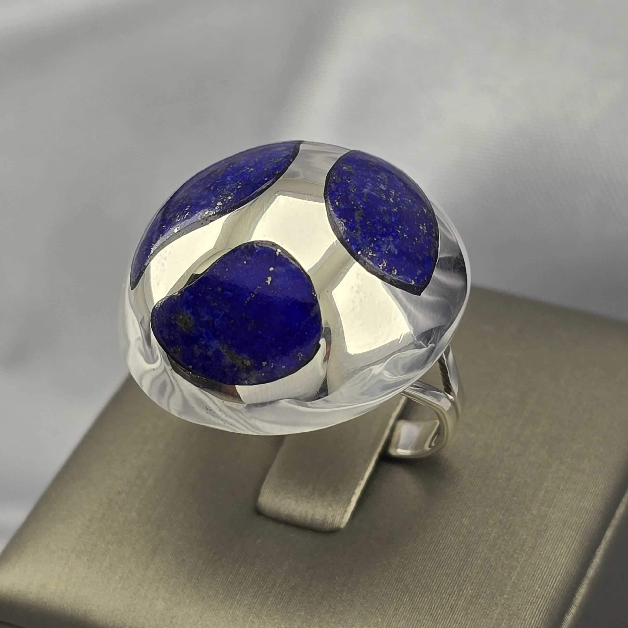 Este anillo destaca por su estilo auténtico y artesanal. Elaborado en plata 950, una aleación reconocida por su pureza y brillo superior, ofrece una pieza resistente, elegante y llena de personalidad. Su diseño incorpora tres piedras de lapislázuli natural, creando una composición armónica que resalta la belleza y el color característico de este mineral.