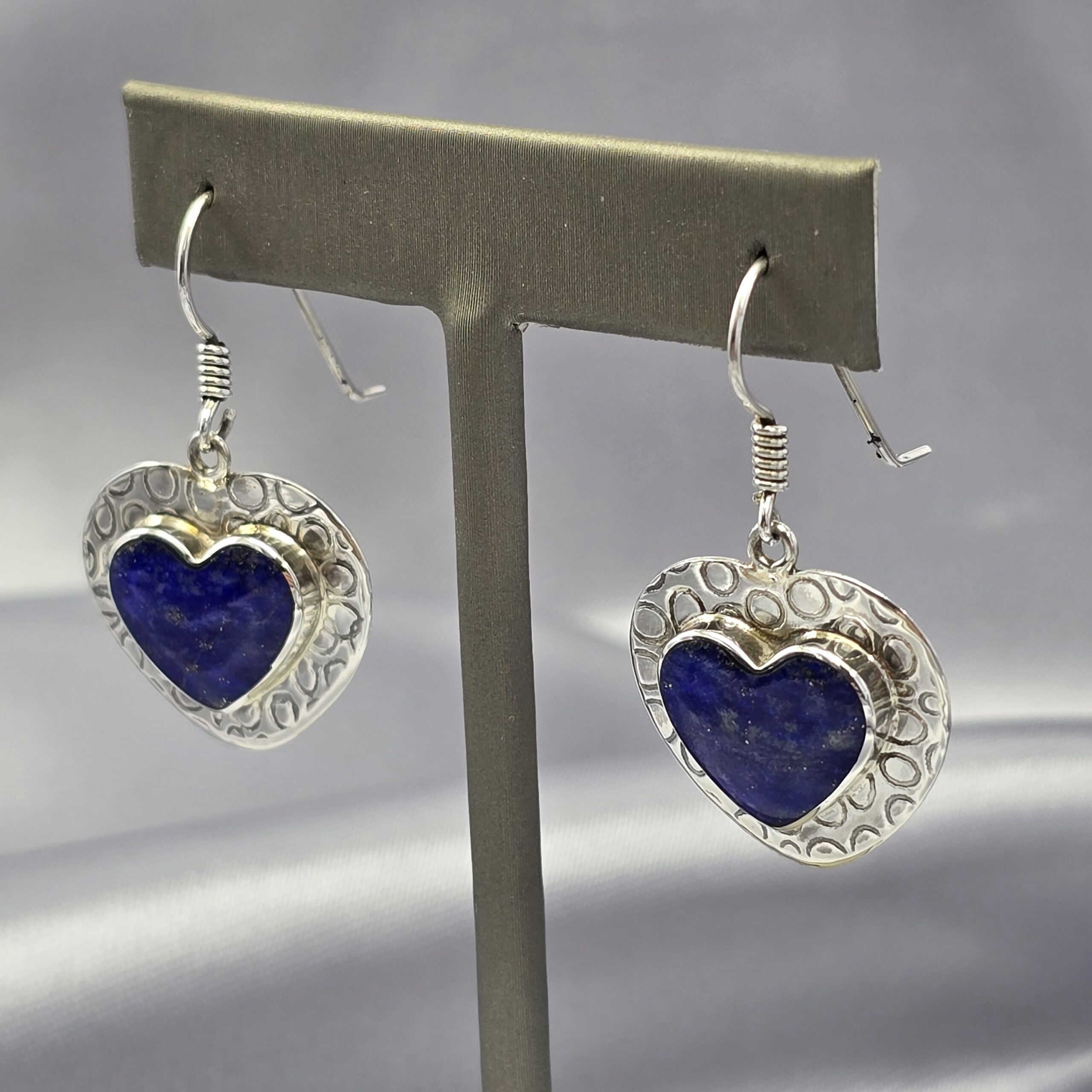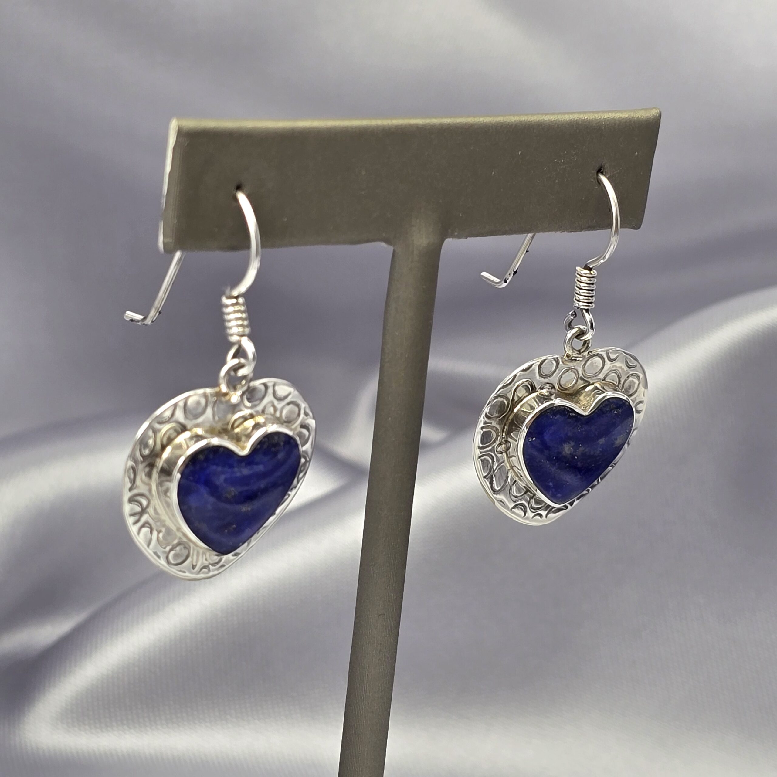 La textura estampada de la plata realza el diseño artesanal y refleja la luz de manera sutil, mientras que el lapislázuli se convierte en el punto focal de la pieza. Su forma de corazón los hace ideales para expresar emociones y añadir un toque romántico y elegante a cualquier look, tanto de día como de noche.