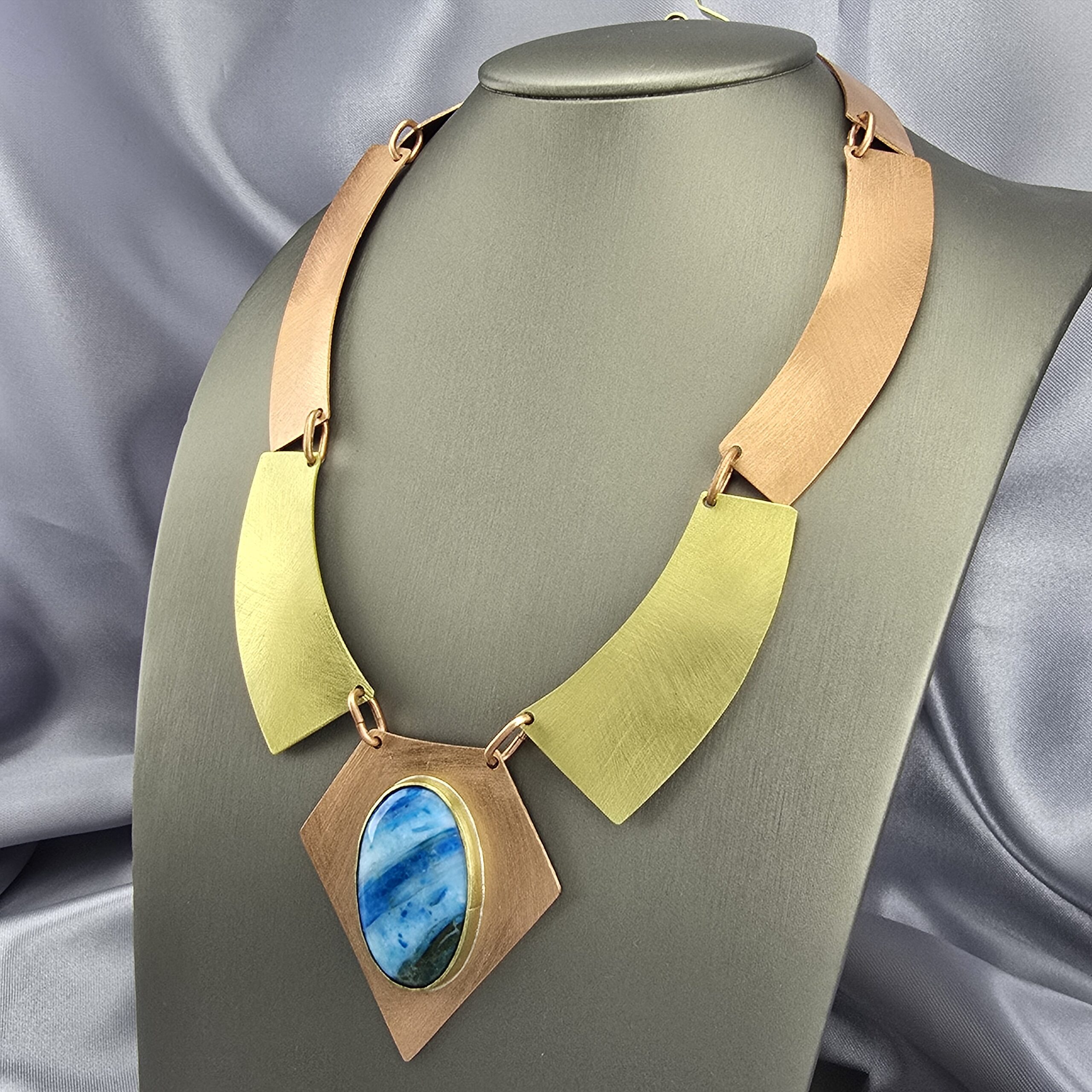 Descubre la combinación perfecta de color y estilo con nuestro Collar de Cobre y Bronce con Ópalo Azul. Cada pieza está elaborada a mano, uniendo la calidez del cobre y la fuerza del bronce con la belleza única del ópalo azul.
