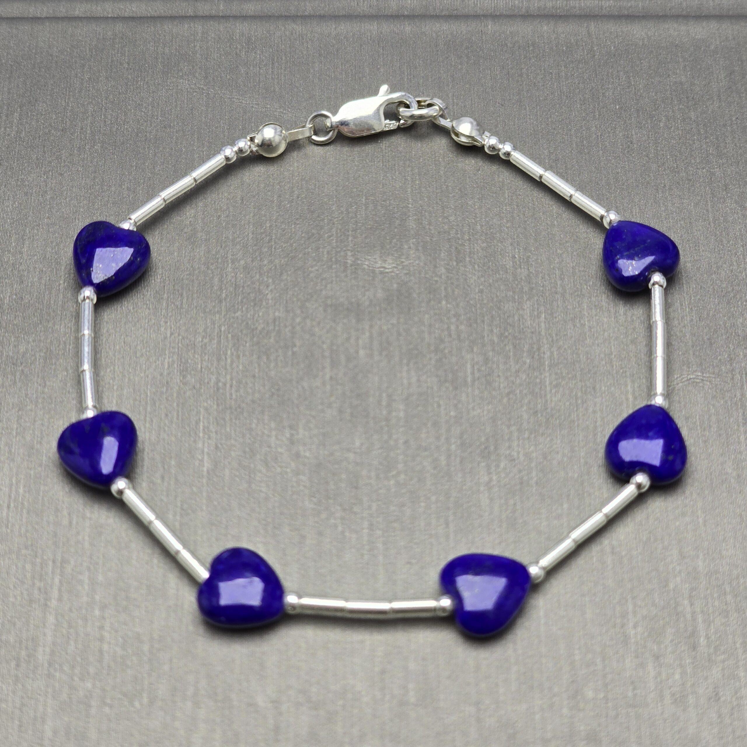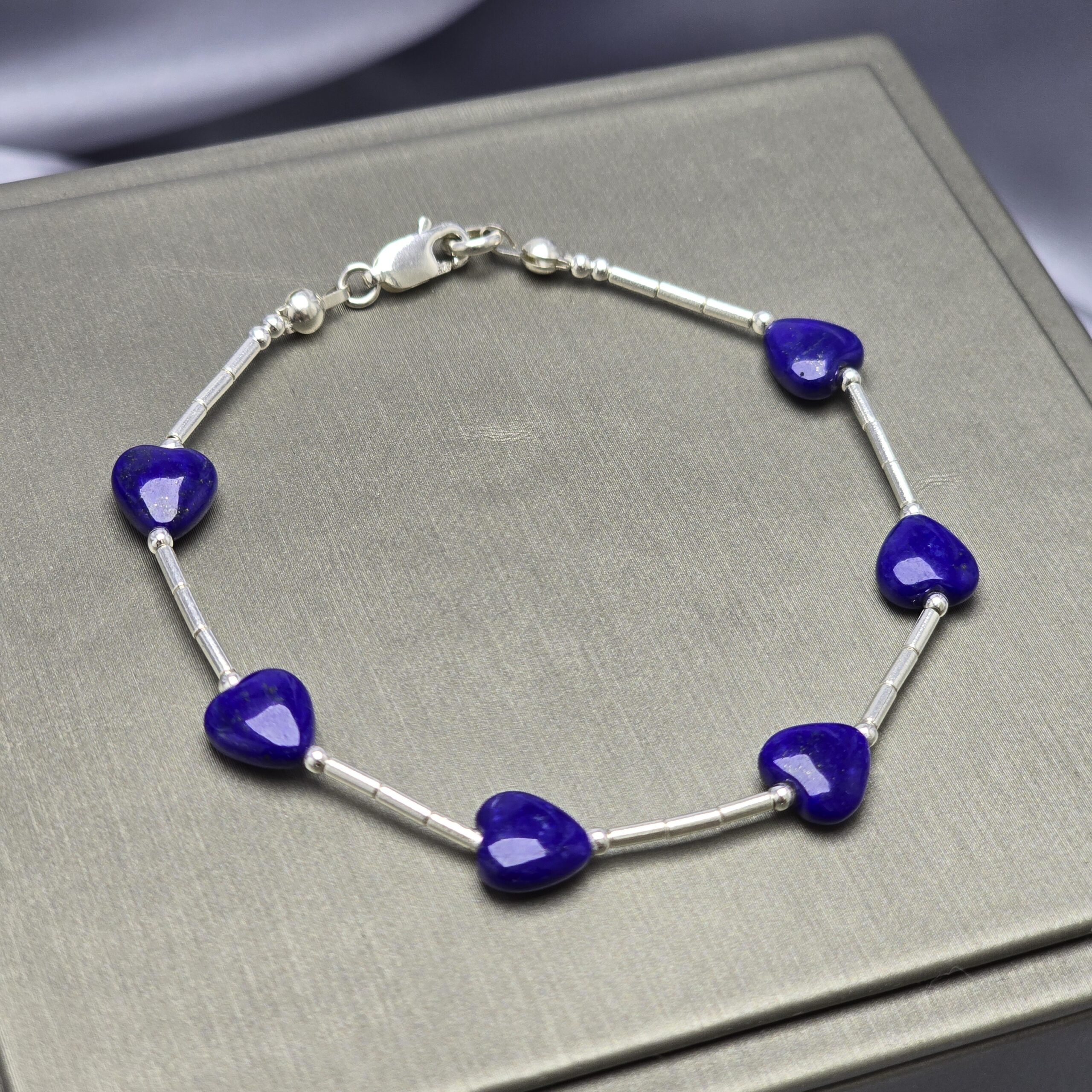 Nuestra pulsera de plata 925 presenta cinco delicados corazones de lapislázuli, piedra semipreciosa conocida por su intenso azul profundo y sus sutiles destellos dorados. Cada corazón simboliza amor, conexión y protección, creando un diseño que combina sofisticación y energía positiva.